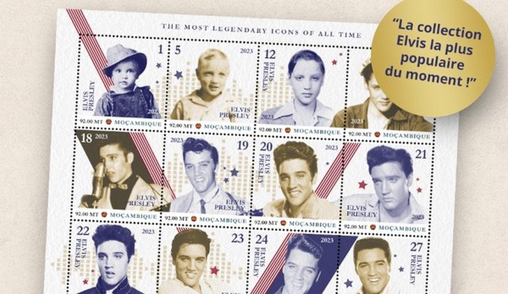 Demandez vite votre feuille de 20 timbres officiels à l'effigie d'Elvis Presley.