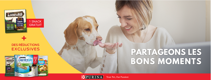 En ce moment, recevez un snack gratuit Adventuros pour chien ainsi que 3 bons de réduction Purina 1+1 gratuit.